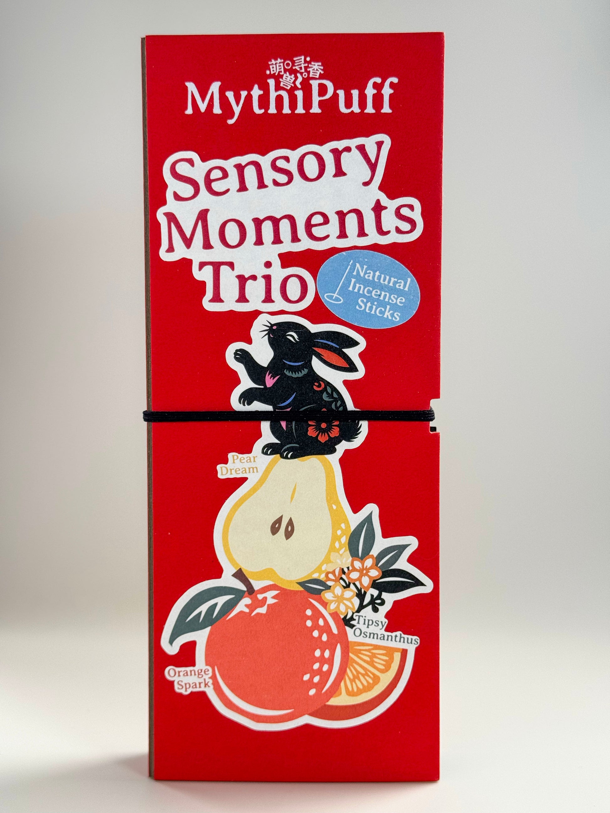 Discover the MythiPuff Sensory Moments Trio, a natural incense sticks set featuring Orange, Osmanthus, and Pear scents. Perfect for aromatic relaxation, this set offers a delightful sensory experience.